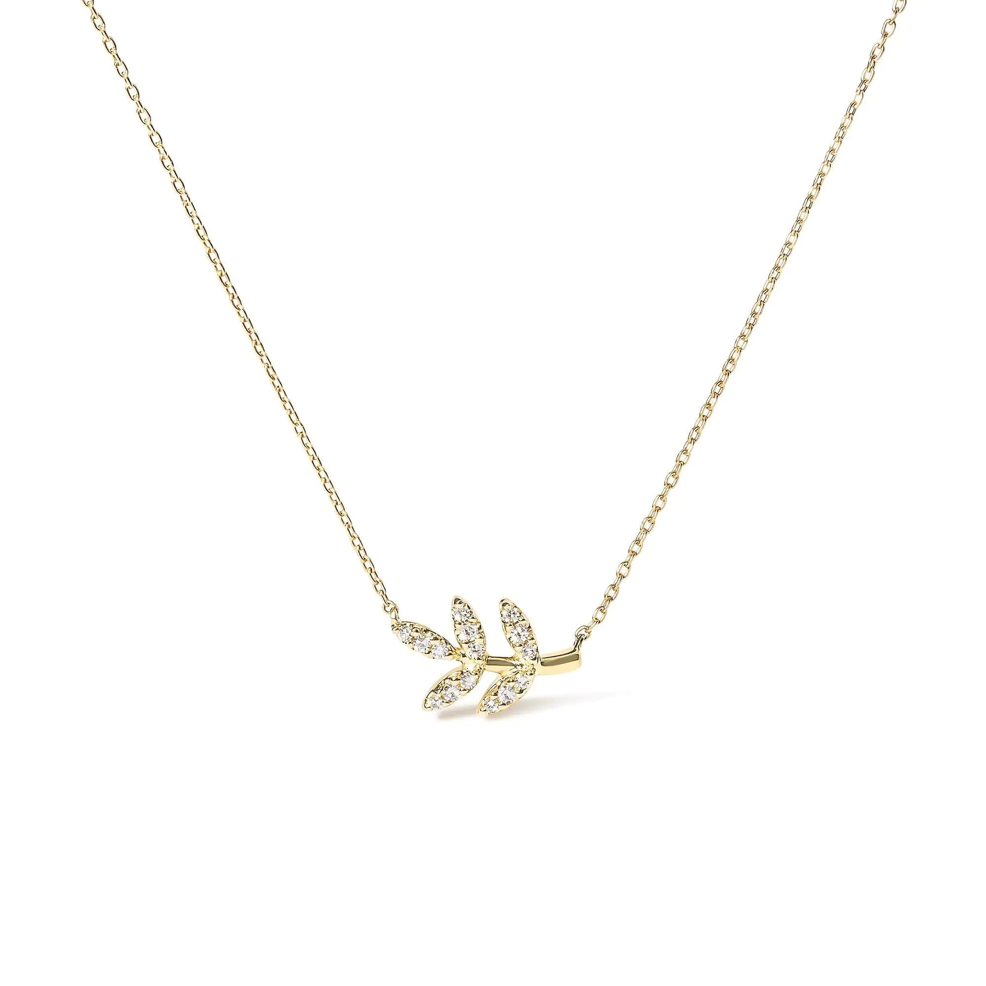 Introducing a mesmerizing masterpiece that will leave you captivated. Crafted in 10K yellow gold, this enchanting pendant necklace features a stunning leaf and branch design, symbolizing growth and harmony. Adorned with 15 round diamonds, totaling 1/10 cttw, the brilliance of these precious stones beautifully complements the warm glow of the gold. The pave setting ensures that each diamond is securely nestled, creating an exquisite display of sparkle. With a spring ring clasp, this necklace effortlessly graces your neckline with elegance and sophistication. Perfect for women who appreciate nature's beauty and desire a touch of luxury, this pendant necklace is a true treasure that will enhance any outfit. Embrace the allure of nature and indulge in the timeless charm of diamonds with this extraordinary piece.