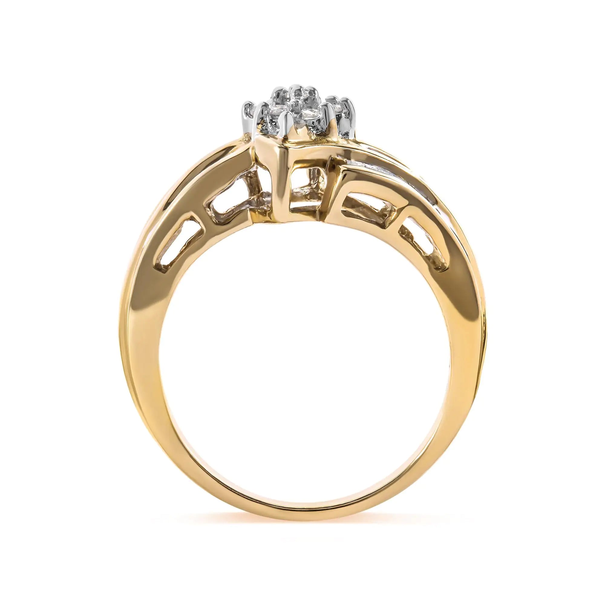 Step into a world of timeless beauty with our 10K yellow gold fashion ring. Crafted with meticulous attention to detail, this exquisite piece is destined to become a cherished treasure in your collection. Set in radiant 10K yellow gold, a captivating cluster of 39 diamonds adorns the ring, including 9 brilliant rounds and 30 dazzling baguette-cuts. With a total weight of 1/2 carat, these diamonds radiate a scintillating brilliance that catches the eye. The H-I color grade ensures a captivating display of light and sparkle, while the I1-I2 clarity grade adds a touch of natural allure. Each diamond is skillfully set in a combination of prong and channel settings, creating a harmonious balance of elegance and security. The cluster head design draws inspiration from nature's beauty, creating a mesmerizing centerpiece that captures the essence of your inner radiance.