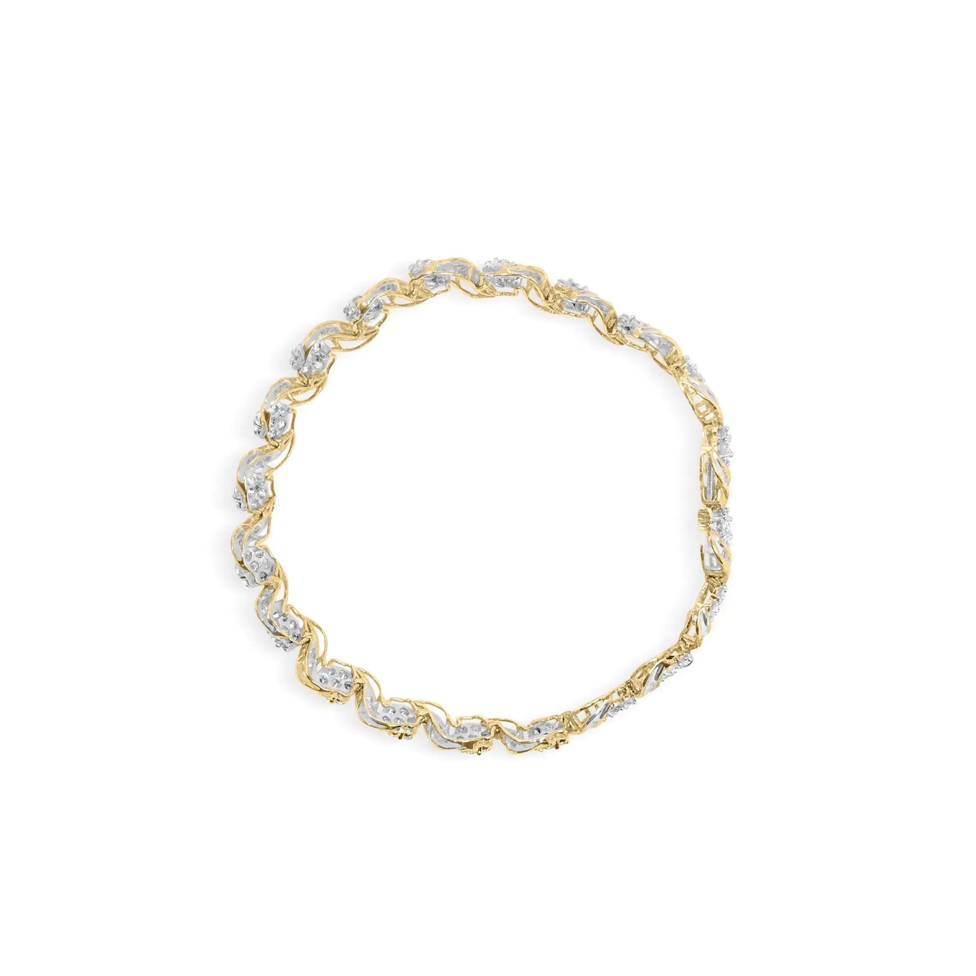 Indulge in the epitome of elegance with this exquisite 10K Yellow Gold Diamond Floral Design Spiral Link Bracelet. Crafted with meticulous attention to detail, this bracelet boasts a mesmerizing floral S-link design, reminiscent of a blooming garden. The 245 dazzling diamonds, with a total weight of 4.00 cttw, gracefully adorn every inch of this piece, creating an enchanting sparkle that captivates all who lay eyes on it. The round and baguette-shaped diamonds, carefully set in a combination of prong and channel settings, showcase their natural brilliance, while the I-J color adds a touch of warmth and radiance. With a length of 7.50", this bracelet is designed to grace the wrist of a confident and sophisticated woman. The secure box clasp ensures a comfortable and worry-free wear. Embrace the allure of nature's beauty and make a statement with this breathtaking diamond bracelet.
