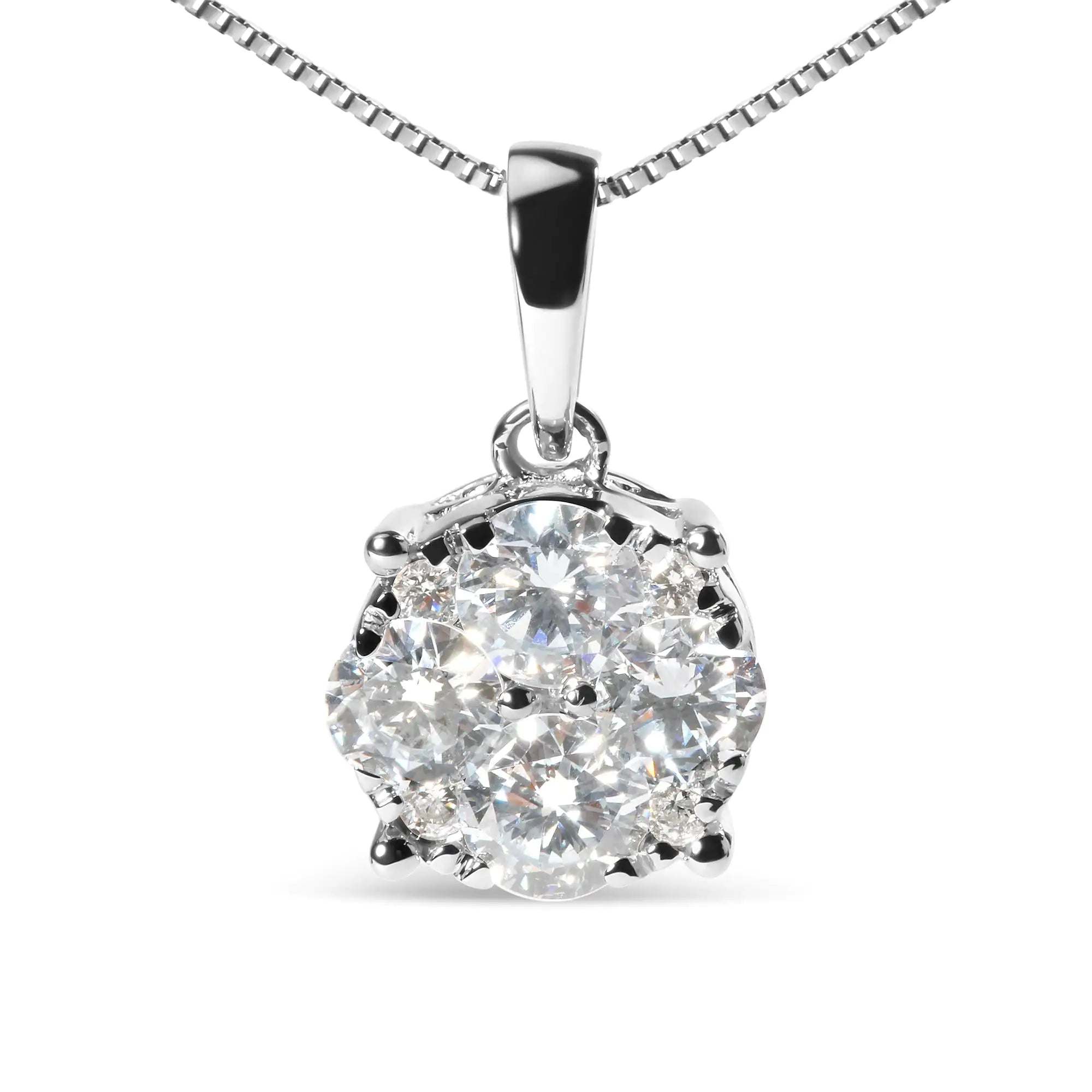 This stunning diamond cluster pendant necklace is sure to make a statement with its exceptional craftsmanship and breathtaking beauty. Made from 14K white gold, this necklace features 8 round, lab grown diamonds totaling 1 carat in weight. The diamonds are of G-H color and VS1-VS2 clarity, ensuring their sparkle and brilliance. The classic prong setting adds a touch of sophistication to any outfit, while the spring ring clasp and box chain ensure a secure and comfortable fit. The 18-inch length is perfect for layering or wearing alone, making this diamond cluster pendant necklace a versatile addition to any jewelry collection. Whether dressing up for a special occasion or adding a touch of glamour to your everyday look, this necklace is the perfect choice for any woman who loves to shine.