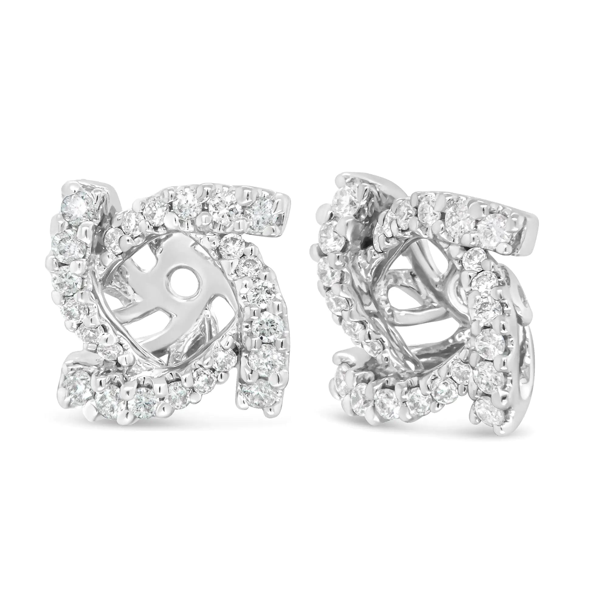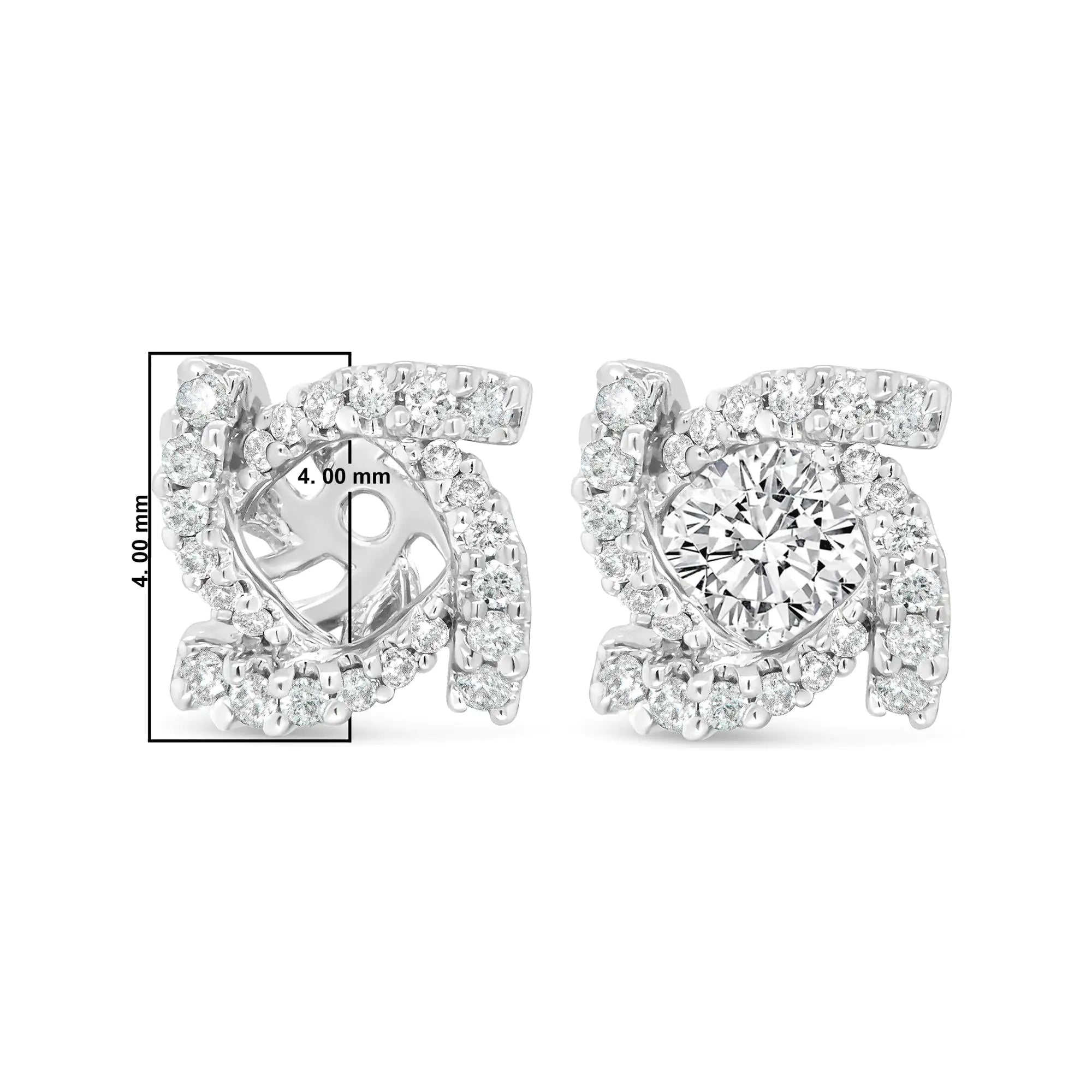 Your favorite pair of diamond studs deserves a fresh new look and you can have it all with these gorgeous diamond earring jackets, made especially to fir your 4mm round stud earrings. A captivating spiral effect encircles your existing studs in sparkling splendor, comprised of round white diamonds in prong settings. These diamonds total 1/3 cttw with an approximate G-H color and VS2-SI1 clarity. This stunning piece is made from genuine 14k white gold, a metal that will stay tarnish-free for years to come!