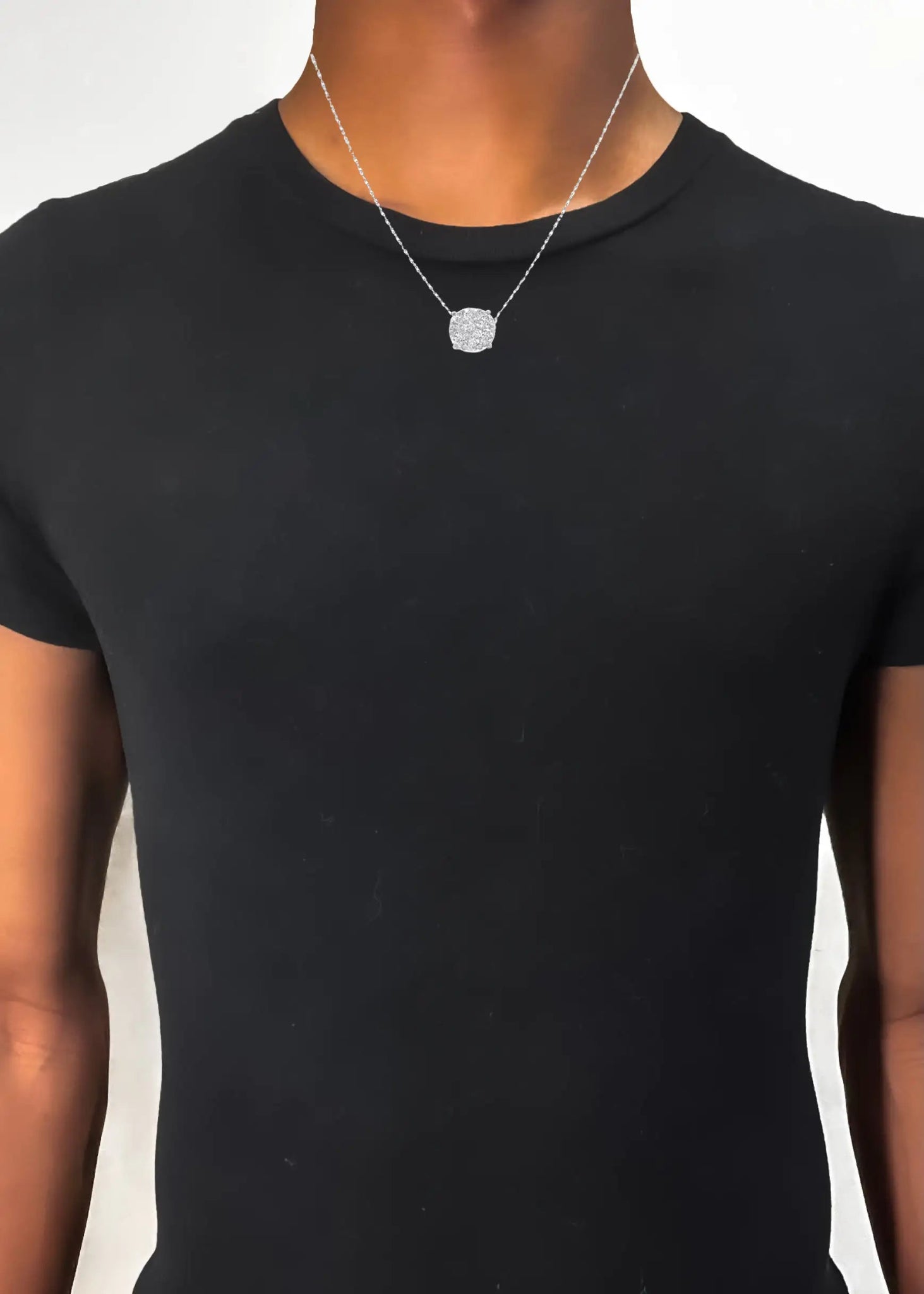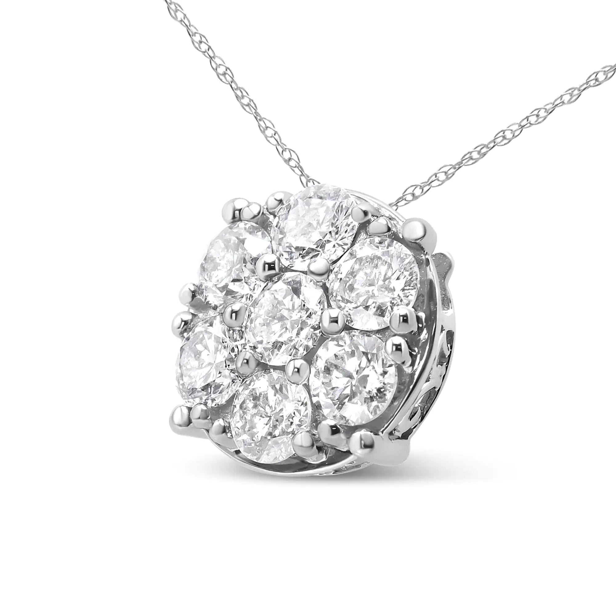 Complete your look with this magnificent 2 1/3 c.t. diamond cluster necklace! The pendant features a floral design of 7 round-cut diamonds in a beautiful shared prong setting. The necklace is crafted in 14k white gold, a metal that will stay tarnish free for years to come. It comes with a gold 18" inch box chain and a spring ring clasp. You will love how this piece rests on your neckline and adds a touch of glamour to your outfit!