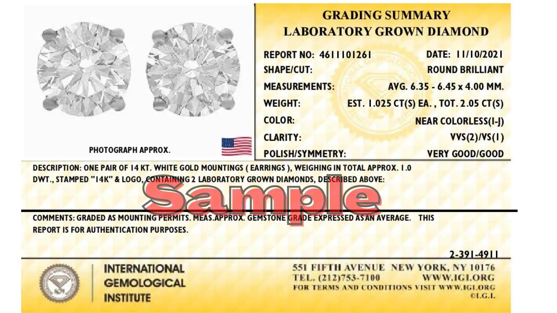 A timeless jewelry essential, these white diamonds studs will bring unparalleled sparkle to your ears. These elegant lab grown diamond stud earrings feature a 4-prong basket setting in a glistening 14k white gold metal. The 2 round, brilliant lab-grown diamonds radiate a beautiful white sparkle as they float within the four-prong setting of these 14k white gold stud earrings. Each lab-grown diamond is crafted to the highest standards and has an approximate VVS2-VS1 clarity and I-J color making them essentially flawless to the naked eye. The studs include dazzling round-cut lab grown diamonds with a total weight of 2 carat and come with screw backs for a secure and comfortable fit.