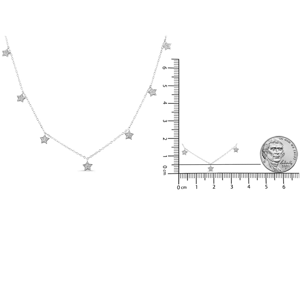 Set your sights to the sky with this heavenly multi-star dangle droplet pendant necklace. This celestial pendant necklace is adorned with multiple star silhouettes, each set with clusters of glimmering prong-set diamonds for a total 1/3 cttw of an approximate I1-I2 clarity and H-I color. This .925 sterling silver necklace features a tarnish-resistant micron plating preventing corrosion for beautiful longevity of the piece. The contemporary 18" rope chain complements any neckline beautifully and secures with a spring ring clasp.