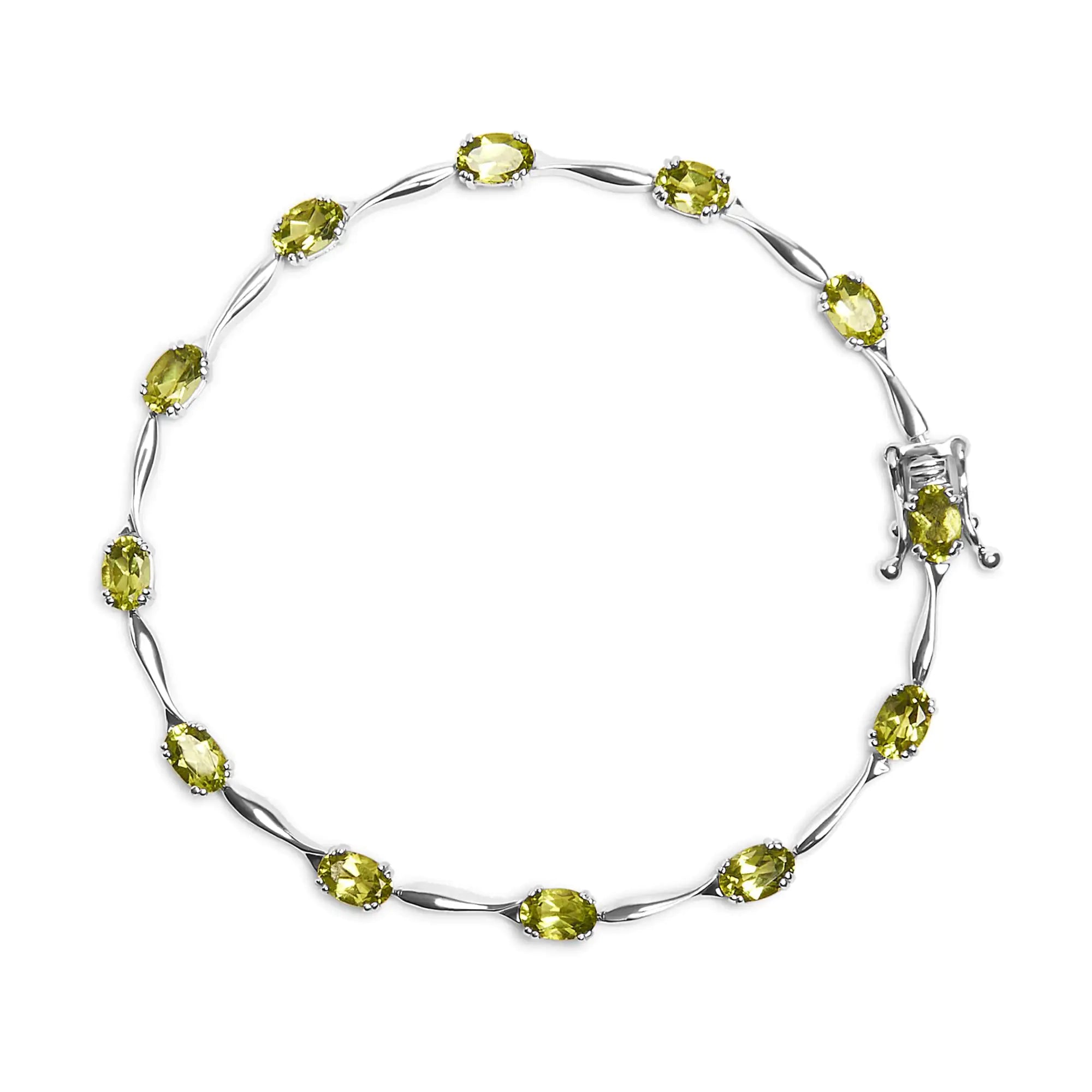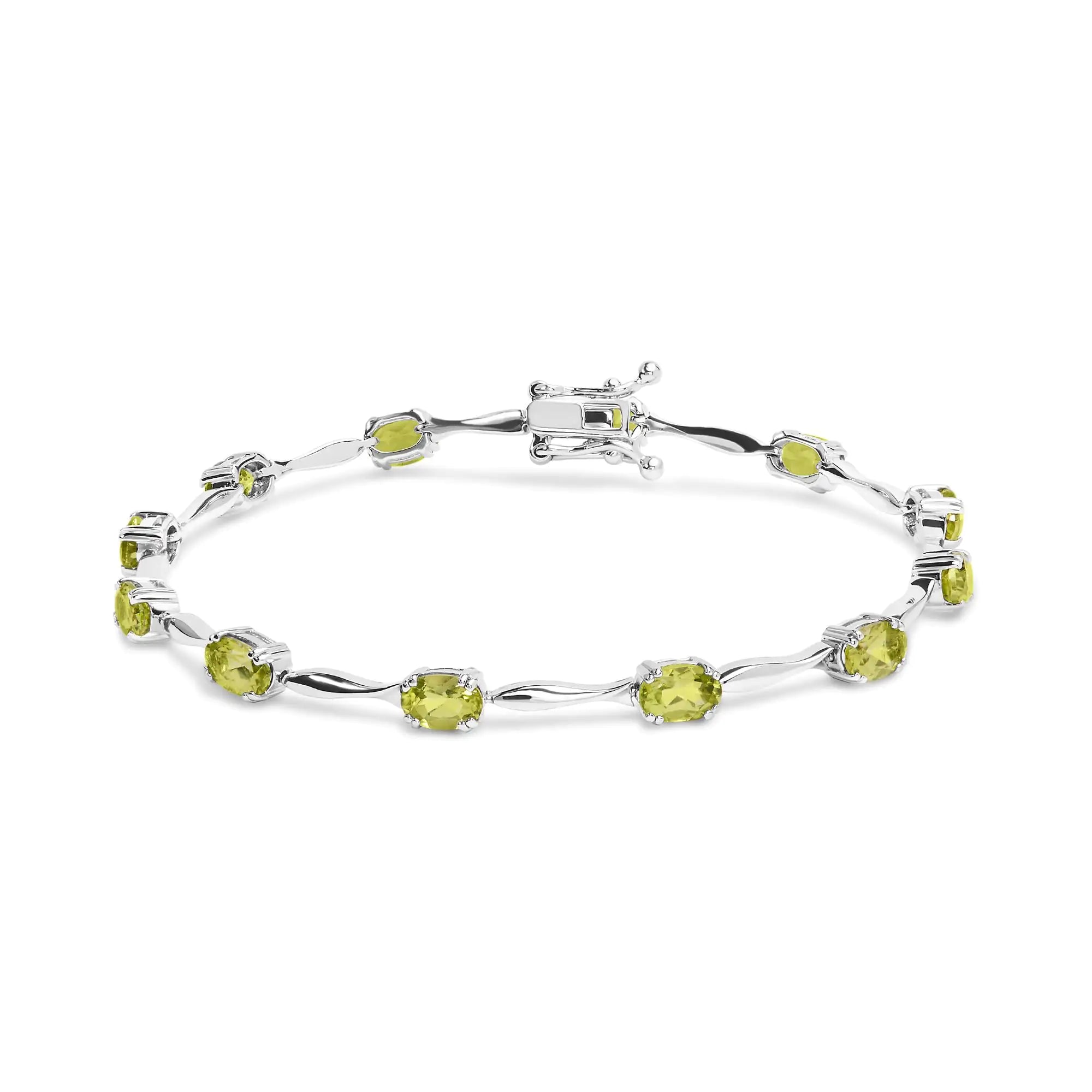 Indulge in the enchanting allure of this exquisite Green Peridot Link Bracelet. Crafted with utmost precision from .925 Sterling Silver, this captivating piece is designed to elevate your style to new heights. The oval-shaped, lab-created Peridot gemstones, totaling 5 1/2 carats, are delicately set in a 4-prong setting, ensuring maximum brilliance and sparkle. With its 7" inches length, this bracelet gracefully adorns your wrist, exuding elegance and sophistication. The box clasp guarantees a secure fit, allowing you to wear it with confidence. Perfectly suited for women who appreciate the beauty of nature, this bracelet beautifully captures the essence of lush greenery. Embrace the allure of this stunning piece and let its vibrant green gemstones mesmerize all who behold it.
