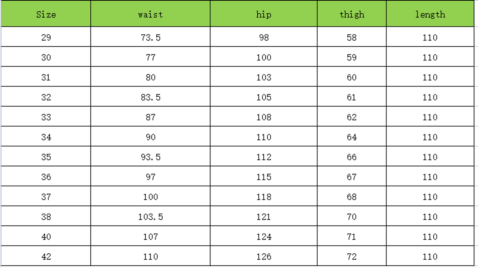 - **Available Sizes:** Waist sizes ranging from 30 to 40 (even sizes) with inseam lengths of 29, 30, 32, and 34 inches.