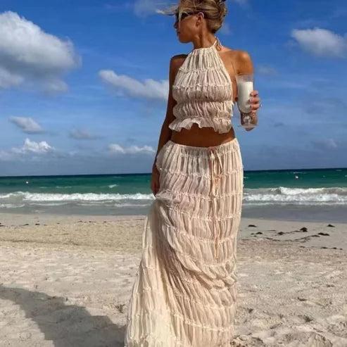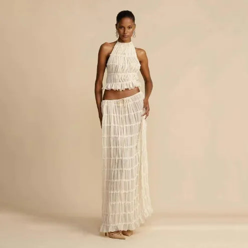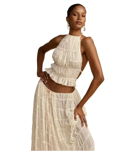 Elevate your summer style with the LaceFlow Set, a chic two-piece outfit designed for effortless elegance. This set features a stylish neck vest adorned with delicate lace, adding a touch of romantic charm, while the ruched long skirt offers a graceful and trendy silhouette. The alluring backless design showcases your feminine allure, making it perfect for both casual outings and special occasions. Crafted with high-quality materials and attention to detail, the LaceFlow Set ensures you look stunning and feel confident, no matter where your day takes you.